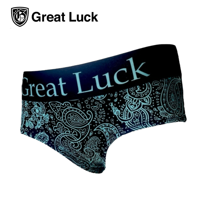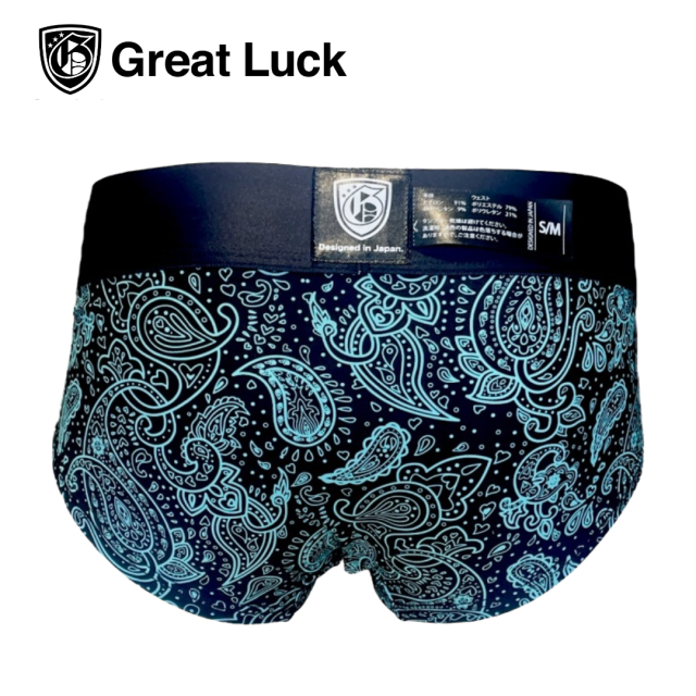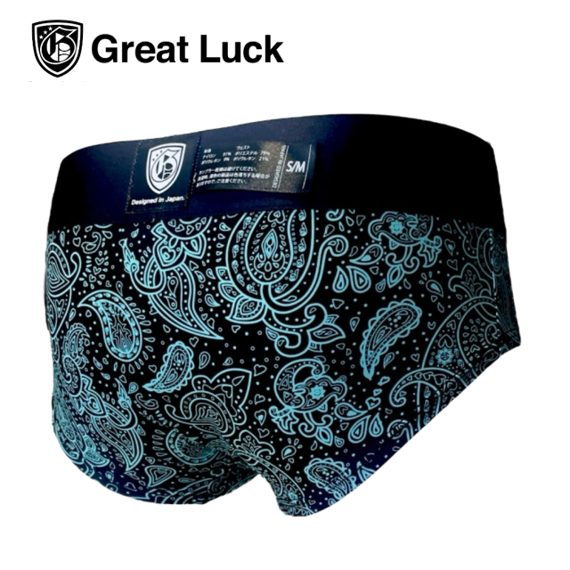 『ペイズリーBLUEGREEN』 ペイズリー柄の中にさりげなくハートがあります。幸運を運ぶハートでありますように。 Great Luckのブランド語源は、めちゃくちゃ幸運!大吉という意味!! 穿く方の幸運を願った1枚です。