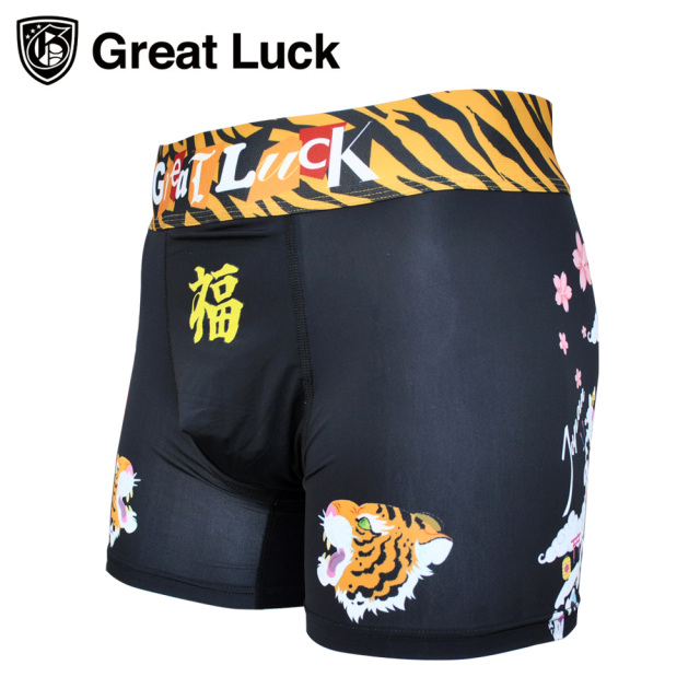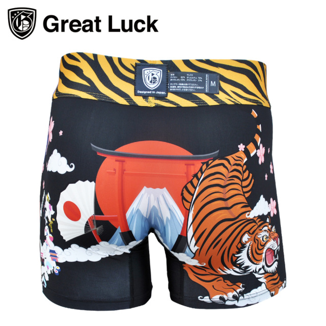 『福TIGER』 日本をモチーフに福をイメージしたデザインです。寅は、古来より邪気払いや家族を守るなど言われ、勇敢で争いごとにも強いため、縁起の良い動物とされています。「千里行って千里帰ることができる」という云われから、出て行ったお金を呼び戻してくれる効果があると信じられています。 Great Luckのブランド語源は、めちゃくちゃ幸運!大吉という意味!! 穿く方の幸運を願った1枚です。 生地 ナイロン-85% ポリウレタン- 15% ウェストゴム ポリエステル-79% ポリウレタン-21%