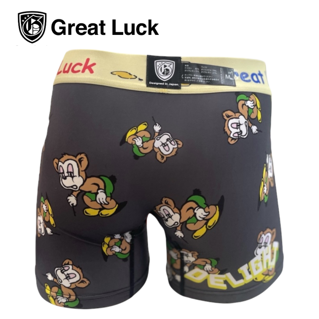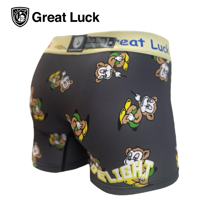 『ディラクマ(BLACK)』 Great LuckとDELIGHTくま(ディラクマ)コラボです。縁起の良い贈り物としてもおすすめです。 「デザイン説明」 北海道のお土産としても有名な『木彫りの熊』ですが、「熊みたいに大きくなれ」「大物になれ」と子供の成長に縁起の良いものと考えられ伝えられてきました。 そこから転じて「試練に打ち勝つ」「試験に合格する」と言われ、縁起をかついで受験のお守りにしたり「魔除け」「災難除け」とされました。招きクマの手(熊手)には「福を招く」「福をかき集める」と言われるようになりました。ディラクマを履いて幸運が訪れますように。 Great Luckのブランド語源は、めちゃくちゃ幸運!大吉という意味!! 穿く方の幸運を願った1枚です。 ブランド名「Great Luck」Great Luck=幸運パンツ 「商品の特徴」 ボクサーパンツのフロント内部に立体スペースがあり、ムレにくい、ブレにくい ポジションが気になりにくい事が特徴です。 生地がサラッとだから乾きも早い。 インクジェットプリント色落ちしづらく長持ちする。 快適で、履きやすく、長持ちと三拍子が揃ったボクサーパンツです。 生地 ナイロン-85% ポリウレタン- 15% ウェストゴム ポリエステル-79% ポリウレタン-21%