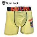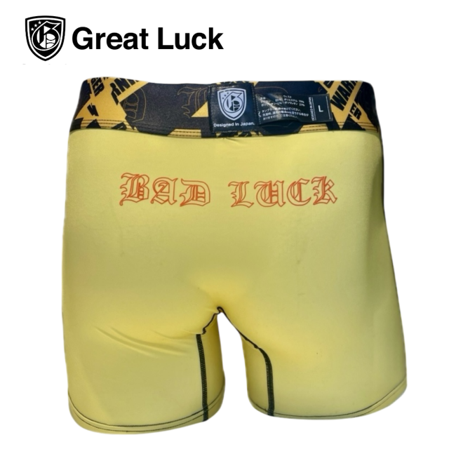 『BAD LUCK』「デザイン説明」 嫌なことがあっても、大丈夫! それは、いいことが起こる前兆 Great Luckのブランド語源は、めちゃくちゃ幸運!大吉という意味!! 穿く方の幸運を願った1枚です。 ブランド名「Great Luck」Great Luck=幸運パンツ 「商品の特徴」 ボクサーパンツのフロント内部に立体スペースがあり、ムレにくい、ブレにくい ポジションが気になりにくい事が特徴です。 生地がサラッとだから乾きも早い。 インクジェットプリント色落ちしづらく長持ちする。 快適で、履きやすく、長持ちと三拍子が揃ったボクサーパンツです。 生地 ナイロン-85% ポリウレタン- 15% ウェストゴム ポリエステル-79% ポリウレタン-21%