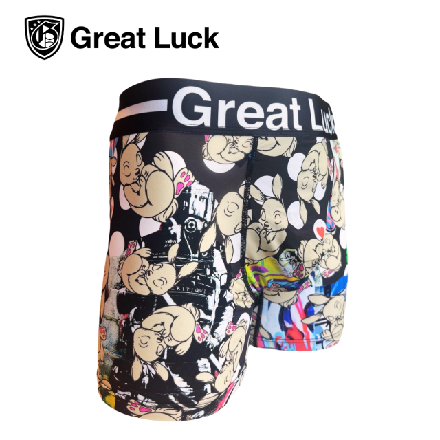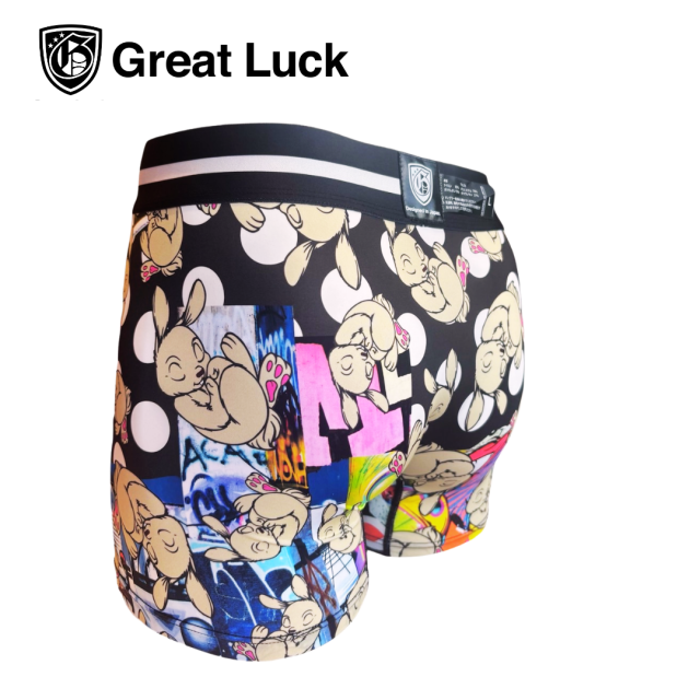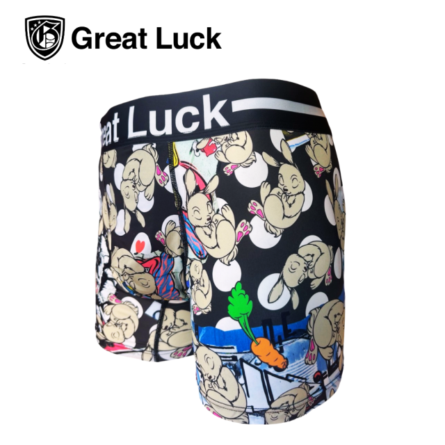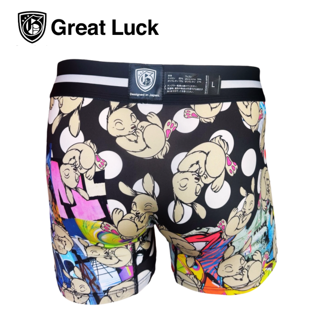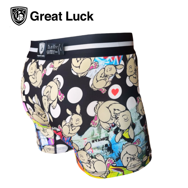 『ラビット(BLACK)』 人気シリーズのNEWバージョンです。REDのワンポイントハートが可愛いです。 うさぎは逃げ足も速く「兎」が「免」に似ていることから災難や悪運、悪い気などから免れることができる、避けることができると言い伝えがあり、アメリカではラビットフット(ウサギの後ろ足)はお守りや魔除けともいわれています。その他、長寿の神様や子孫繁栄、商売繁盛、困難をピョンピョン飛び越えることから、全ての物事が順調に進むことを表しているとされています。 Great Luckのブランド語源は、めちゃくちゃ幸運!大吉という意味!! 穿く方の幸運を願った1枚です。 ブランド名「Great Luck」Great Luck=幸運パンツ 「商品の特徴」 ボクサーパンツのフロント内部に立体スペースがあり、ムレにくい、ブレにくい ポジションが気になりにくい事が特徴です。 生地がサラッとだから乾きも早い。 インクジェットプリント色落ちしづらく長持ちする。 快適で、履きやすく、長持ちと三拍子が揃ったボクサーパンツです。 生地 ナイロン-85% ポリウレタン- 15% ウェストゴム ポリエステル-79% ポリウレタン-21%