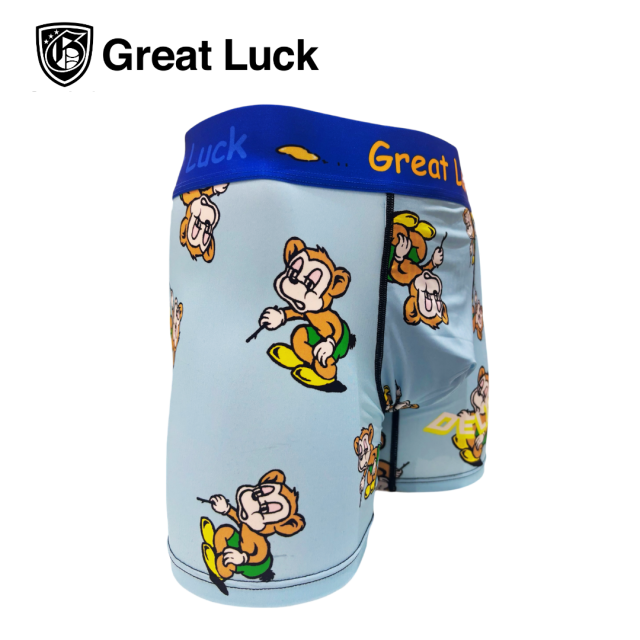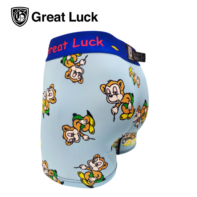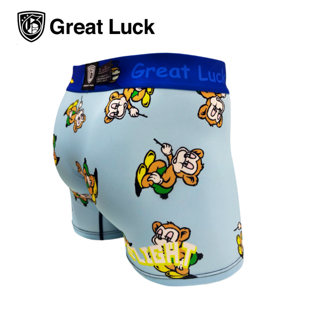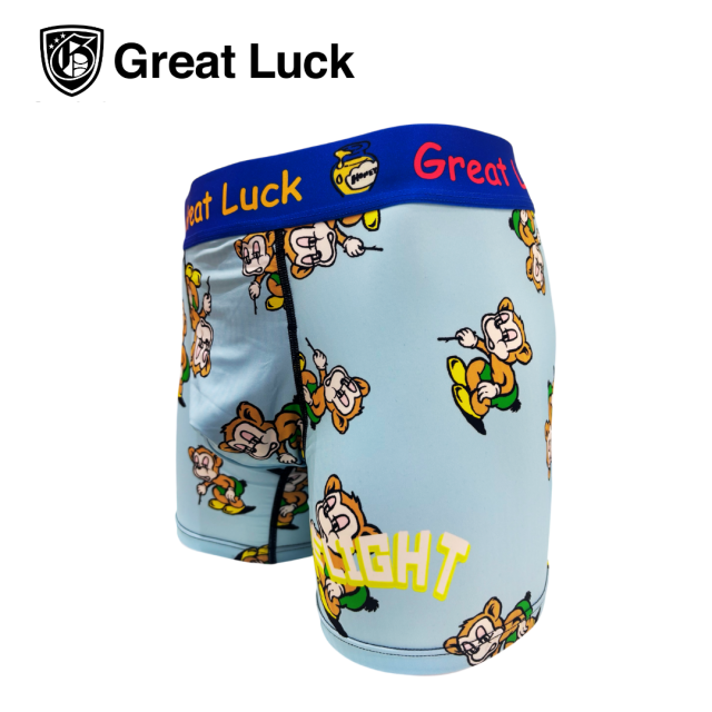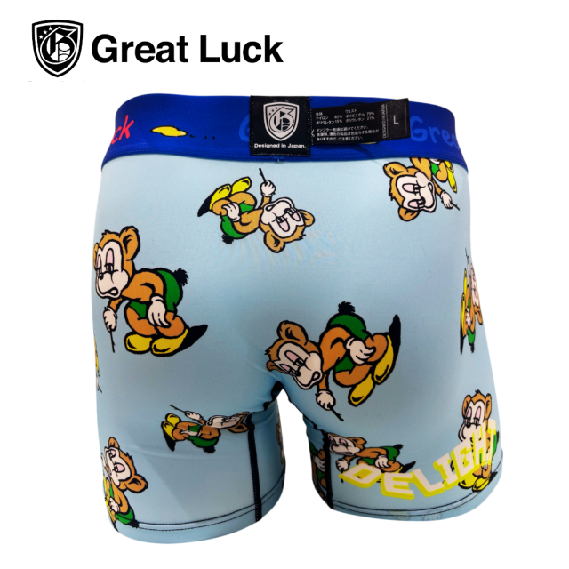 『ディラクマ(BLUE)』 Great LuckとDELIGHTくま(ディラクマ)コラボです。縁起の良い贈り物としてもおすすめです。 「デザイン説明」 北海道のお土産としても有名な『木彫りの熊』ですが、「熊みたいに大きくなれ」「大物になれ」と子供の成長に縁起の良いものと考えられ伝えられてきました。 そこから転じて「試練に打ち勝つ」「試験に合格する」と言われ、縁起をかついで受験のお守りにしたり「魔除け」「災難除け」とされました。招きクマの手(熊手)には「福を招く」「福をかき集める」と言われるようになりました。ディラクマを履いて幸運が訪れますように。 Great Luckのブランド語源は、めちゃくちゃ幸運!大吉という意味!! 穿く方の幸運を願った1枚です。 ブランド名「Great Luck」Great Luck=幸運パンツ 「商品の特徴」 ボクサーパンツのフロント内部に立体スペースがあり、ムレにくい、ブレにくい ポジションが気になりにくい事が特徴です。 生地がサラッとだから乾きも早い。 インクジェットプリント色落ちしづらく長持ちする。 快適で、履きやすく、長持ちと三拍子が揃ったボクサーパンツです。 生地 ナイロン-85% ポリウレタン- 15% ウェストゴム ポリエステル-79% ポリウレタン-21%